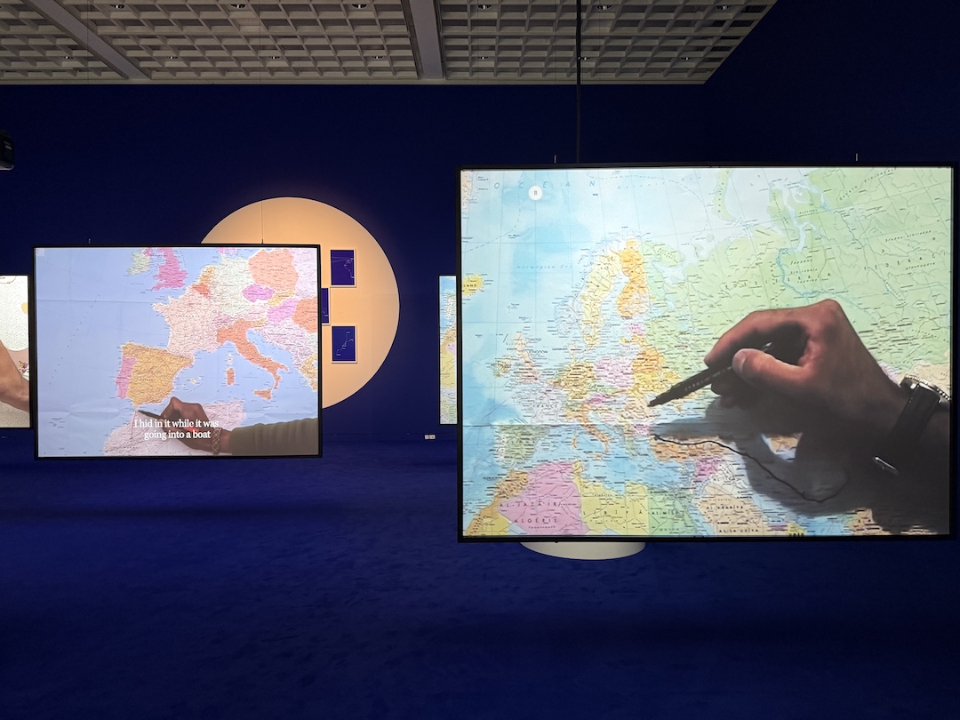 All the work is amazing to look at, but two exhibitions stuck out to me. One is the work of Robert Longo who does these large, photo-realistic charcoal drawings that have a level of detail and realism that is beyond what I though would be possible in a handmade piece of art, let alone through charcoal. The second was a series of videos by Bouchra Khalili where “individuals recount their forced illegal journeys” while drawing it on a map. A birds-eye shot of the map shows their hand as they sketch the kilometres of travel they have undertaken to find work or safety, while off-screen they talk about why they made certain decisions and how they travelled.