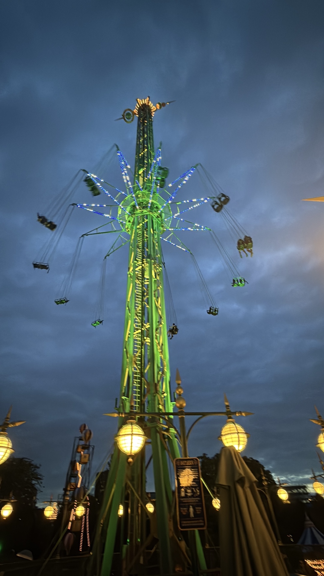 As the sun set and night was closing in, Hayley and Joëlle disappeared off to The Star Flyer, one of those tall poles with dangling chairs that lifts everyone up while spinning, meaning the chairs all flair out and fly through the open air. I passed on this one; I knew my limits. When the other two came down (literally and figuratively) there were whisperings of a second go, but an election not to. Then, as we were leaving the worker ran up to us; there were a couple of kids that wanted to go on it, but they needed some adults to balance it all out–would we be interested in helping?
