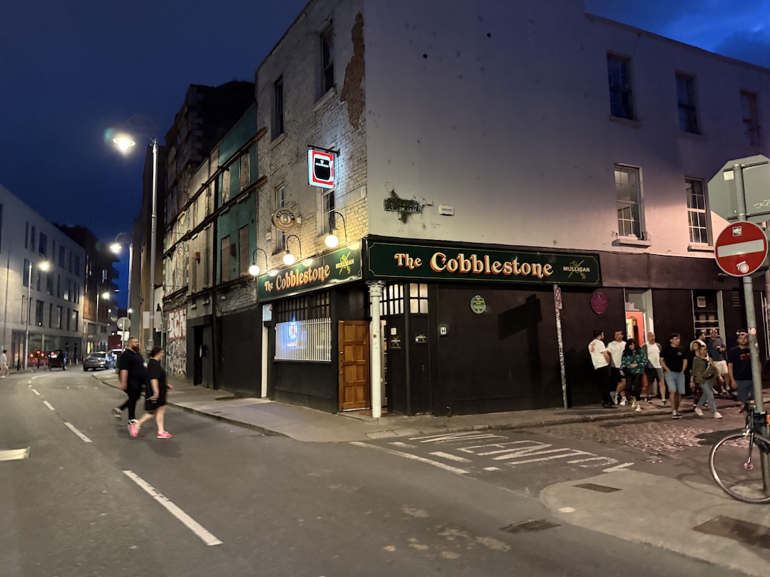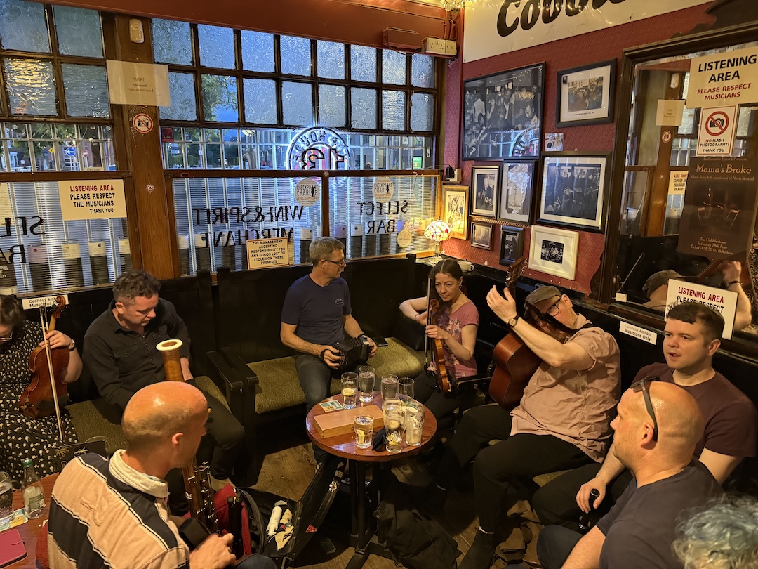 —walking into the Cobblestone, you’re met with rough floorboards, the timeless mirrored bar. Locals chatting away and revellers trying to find the clearest spot to get a bartender. Seating for chats on the right, gaeilge way-finding everywhere. To the left, the musicians area. No stage, reserved seating. Crowding around, listeners SHHHHHHHH the entire pub as the music gets going.