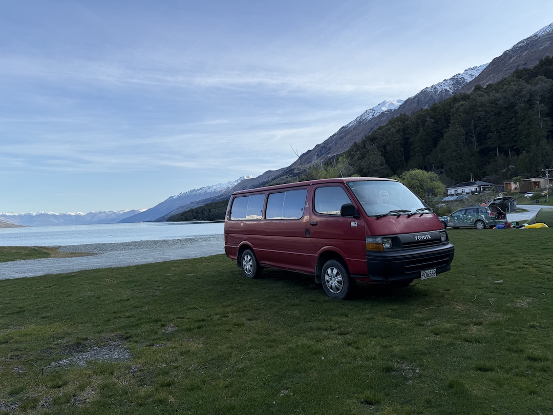 We headed off from Queenstown towards Kinloch, a small town on the shoreline of Lake Whakatipu (same as Queenstown). Another 20mins on from the township was a DOC campground that looked to have great views and bare bones facilities, making it the perfect shakedown spot for the van.