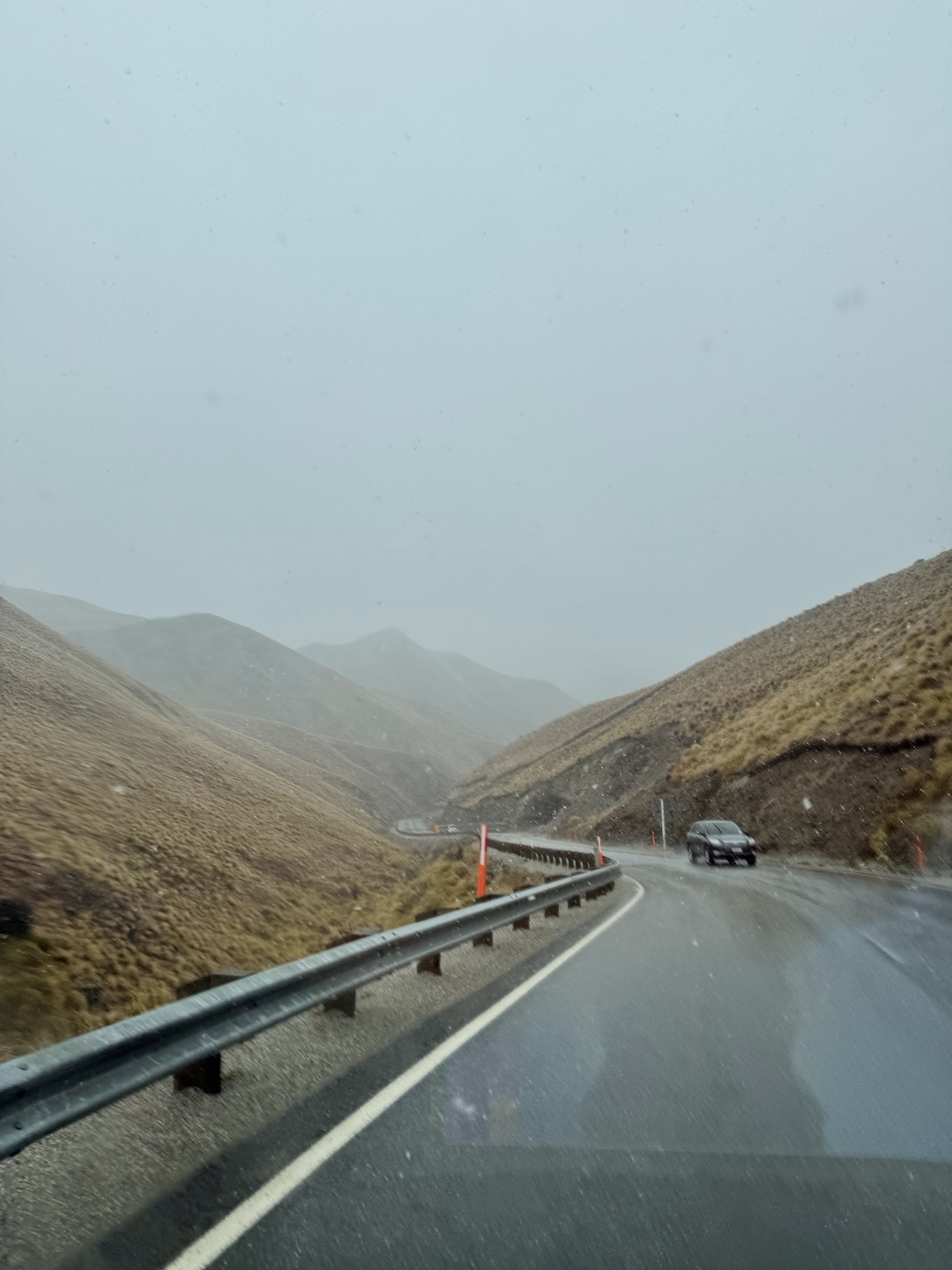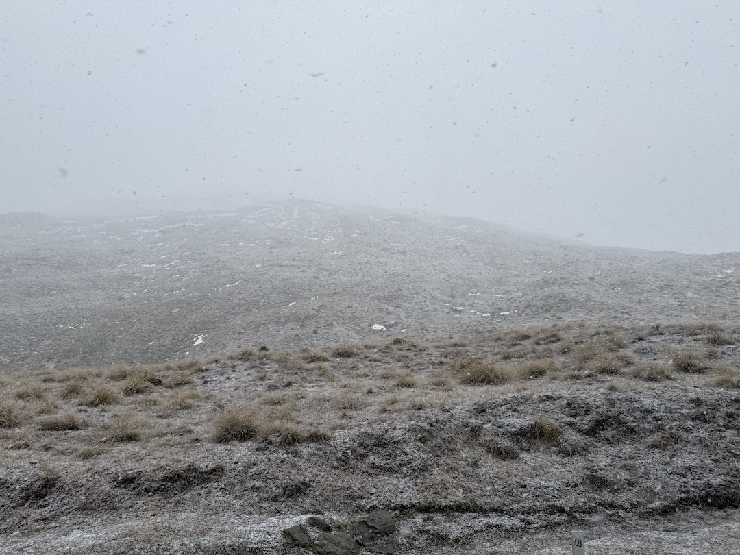 On the road again, towards Wānaka. Heading over the Crown Range, we encountered a snow flurry as we crossed ~600m in elevation. With no chains, we took the gamble as the road was still clear and no signs of ice. Plus, the road was still busy with standard traffic. Two aussies panicked, the kiwis took it in their stride.